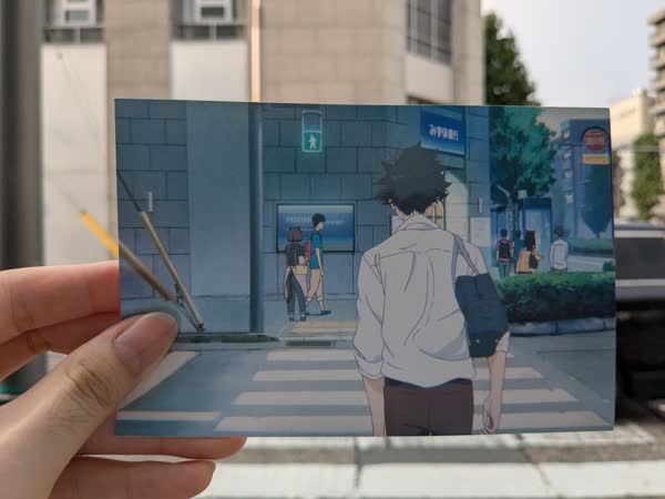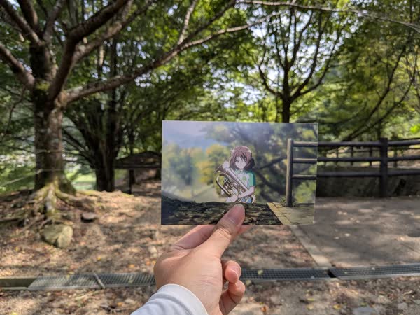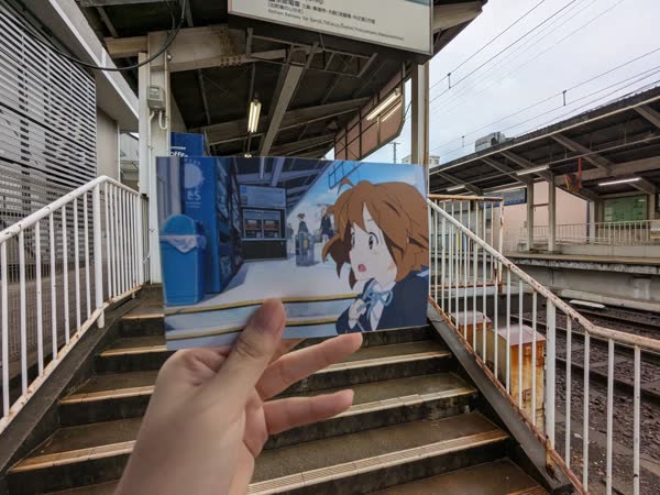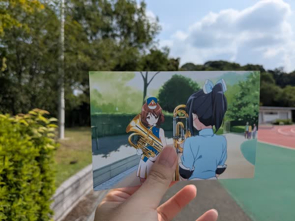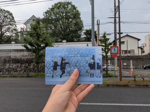 從日比野站與西高藏站下車走過去都差不多遠,我想既然京吹中的斎藤葵就是走這邊的 1 號出口,就搭到日比野站了。出了出口努力找到與截圖一模一樣的角度後,發現真的與動畫一模一樣,唯一差別大概只有樹吧。這是我這次日本行拍的第一張聖地巡禮照片,值得紀念。
