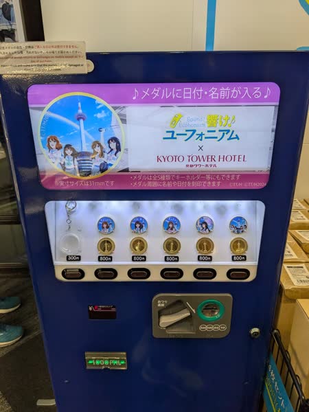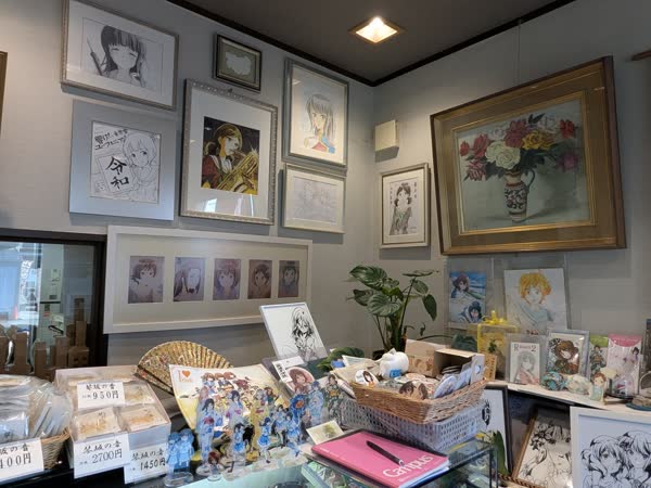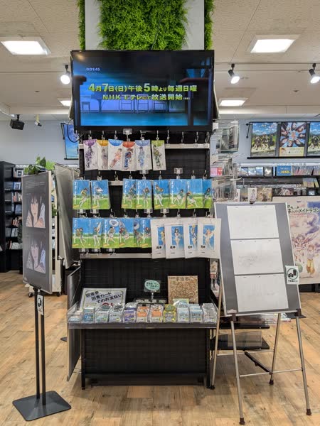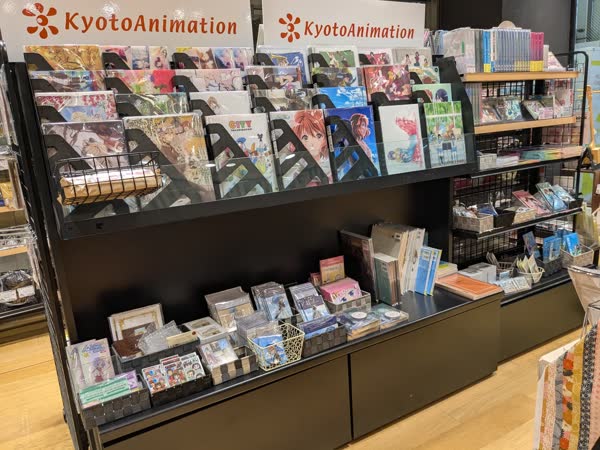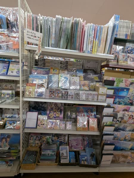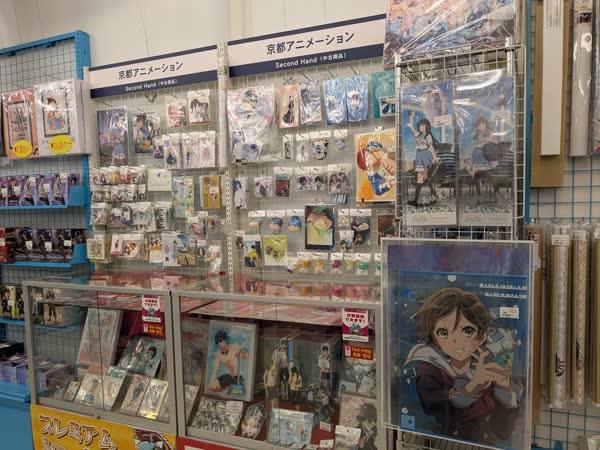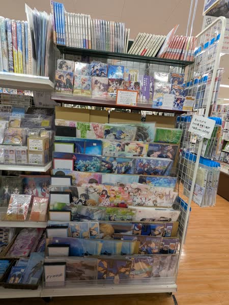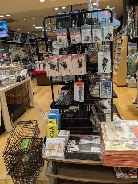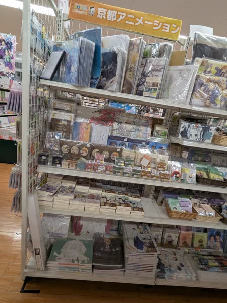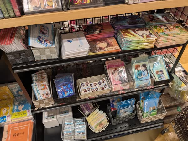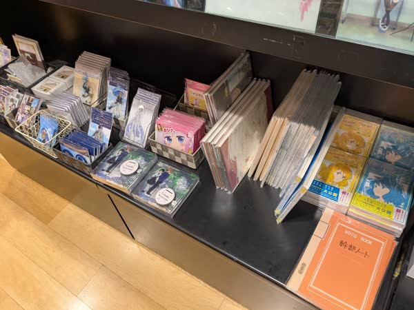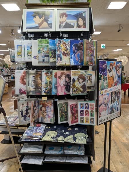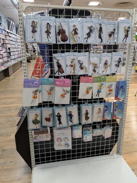 京阿尼商品的架子是整整一個貨架正反面2+4共六個區塊都是,加上側面掛了很多壓克力牌、胸章,規模非常龐大而且商品放得非常密集,商品應該是比宇治的平和書店還要多種類。我其實一直有打算買 3,300 元的京吹御朱印帳,如果在去京都前找到我就可以拿來用了,不過很可惜在這裡與京都的 JEUGIA 都沒找到。