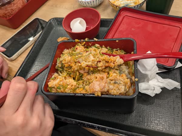 後來我們兩個都點了特上的ひつまぶし,用了一尾鰻魚。吃起來就是魚加上蒲燒之類的調味,不過有點硬硬的口感不太順口。三吃裡面我最喜歡加芥末的吃法,比較有味道、刺激一點。