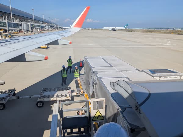 飛機型號是 A320,這次我是選 21F 靠窗的位置,在機翼後面一點,視野還不錯。在機場能看到工人們裝卸托運行李的樣子。