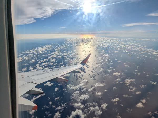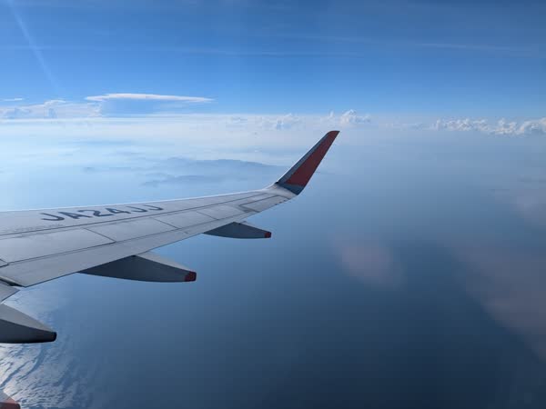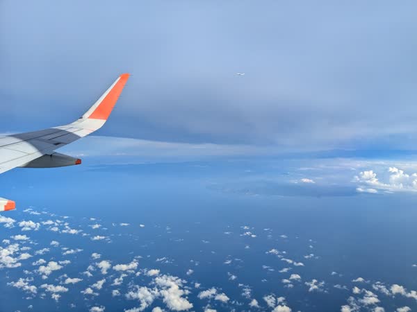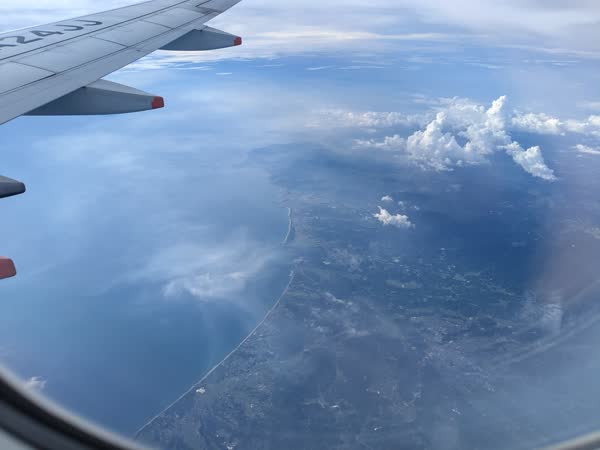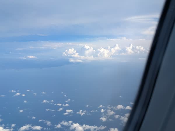 總共盤旋了三圈,其實盤旋的時候還滿不錯的,因為太陽剛好沒有很高,把低空的雲在海面上照出影子,海水也有許多漂亮的波紋。剛好我坐右邊,順時針盤旋時總是能拍到大海(左側翹高高的根本看不到什麼),而且盯著窗外的機翼會感到彷彿在盤旋的不是飛機而是整個地球,是一種非常神奇的感覺,感覺這20分鐘還算值得。
