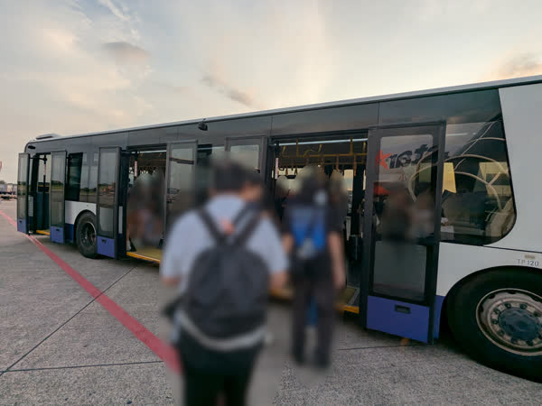 幸好我沒有登機箱,走樓梯非常輕鬆寫意。接駁車應該比正常公車大一點,但還是得要好幾輛才能接完機上的所有人。因為真的有點吵,所以我戴上降噪耳機,多少有點幫助。