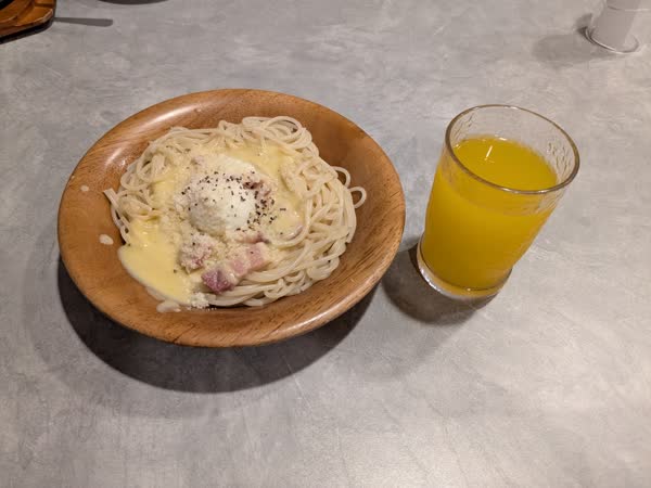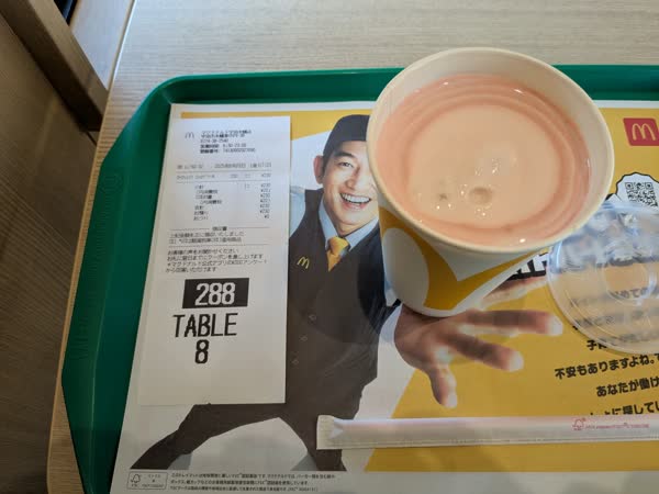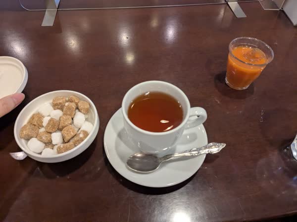 紅茶先端了上來,桌上旁邊有白色、黃色的方糖可以加,突然感覺有點高級感,好像沒那麼盤。畢竟台灣早餐店都是用立頓之類的茶包泡的,口感很澀又加一堆糖,這邊的感覺好喝許多,有香氣又不怎麼苦澀,我只加了兩顆糖。另外還有附贈一杯綜合蔬果汁,與波蜜的一樣是橘色,不過有更多纖維,且有一種特殊味道,現在(8/31)有點忘了。バター&金時あん吐司的紅豆很甜,有大有小,吃起來還不錯。但我還是覺得這餐沒有很對得起它的價格,也許是因為我沒有續紅茶,應該是可以續加的。