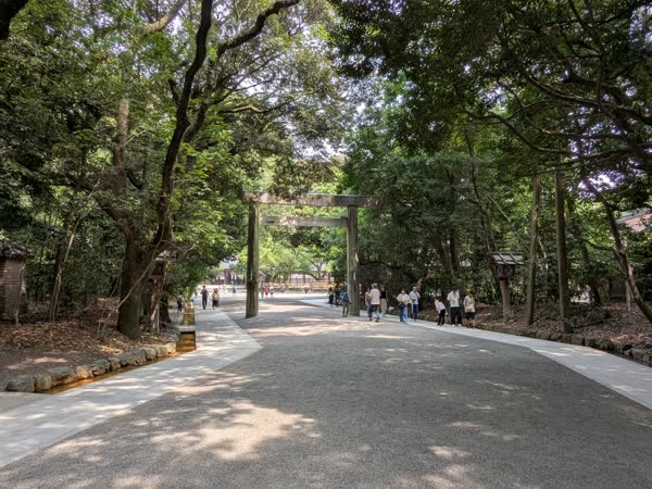 熱田神宮的外觀真的很像東京的明治神宮,都有木製的超大鳥居,而且路也是非常寬的碎石子路。路側有一些說明的牌子,在說熱田神宮的歷史有多悠久,有哪些戰國名將來過之類的。