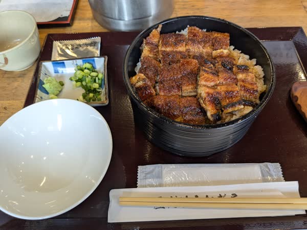 我出發前就有查了一下名古屋的鰻魚飯三吃店,其中我覺得我吃得起評價也不錯的有「昼だけうなぎ屋」與「うなぎのうな泰」,後者類似牛丼店那種型態,自助點餐、取餐、回收餐盤,因此價格非常便宜,不過查一下 Google 地圖評價有人說燒焦什麼的。這兩家店剛好都在榮與大須附近有店。