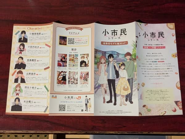 在岐阜車站我主要是想看聲之形的一些場景,比如將也過馬路時看到直花在貓咖打工發傳單的路口,以及與佐原重逢時聊天的椅子。後來在網路上偶然看到 Gifu City Tower 43 的 43 樓觀景台免費開放,所以也打算去看看。另外,我也在 JR 推し旅有在岐阜的一些地方發放小市民的聖地巡禮地圖,事前某高一同學就有說他要一份,上次在豐橋看到限制一人一天一張,所以我想這邊應該也是一樣,剛好與謝一一起拿就有兩份了。我一開始就打算拿著行李箱到處跑,因為當時只打算停留一兩個班次的時間,也就是 15~30 分鐘。而謝一因為他行李箱與背包都非常重,所以就算只停留一小時左右還是找了個コインロッカー了。