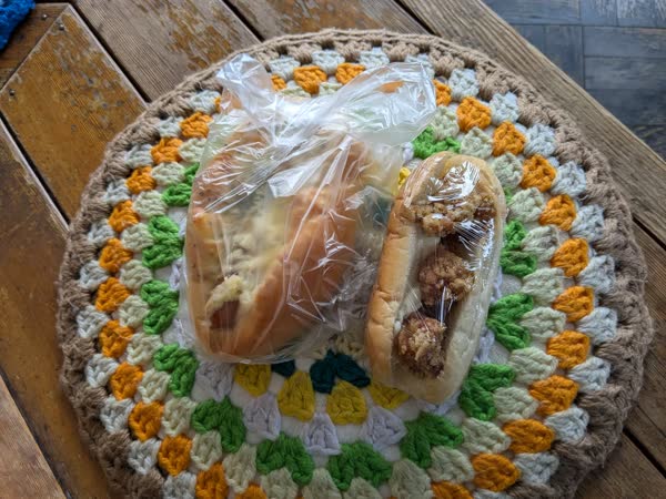 沒錯就是秀一最愛的熱狗麵包,我還真的完全忘了它的存在,翻書包時才找到(飯糰有放在冰箱)。大約 4:30 起來吃早餐,由於當時吃不下全部,所以只吃了熱狗麵包,兩個飯糰帶去大吉山上吃。