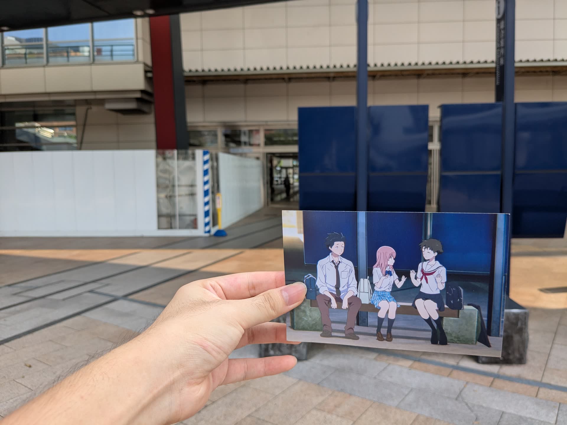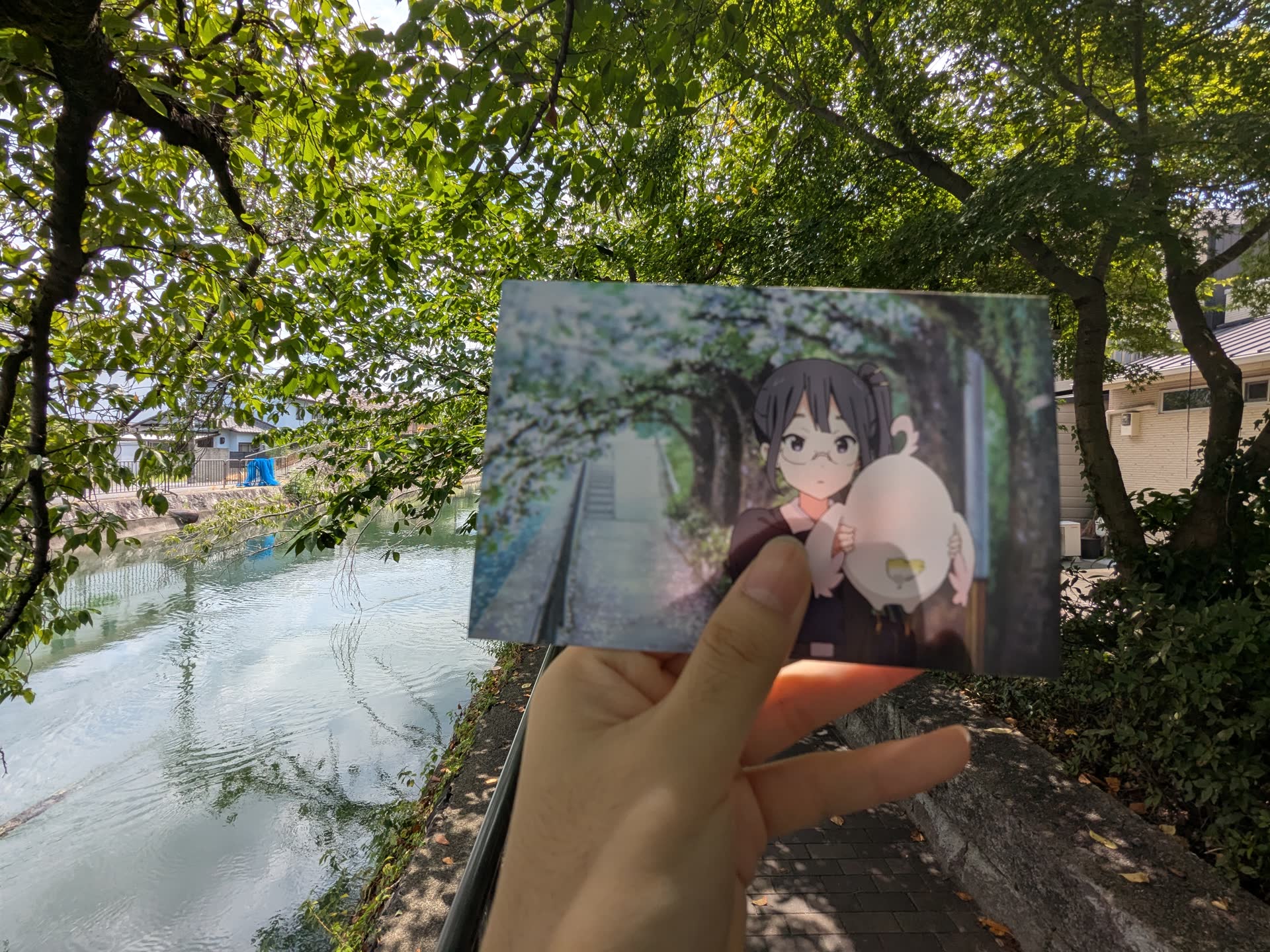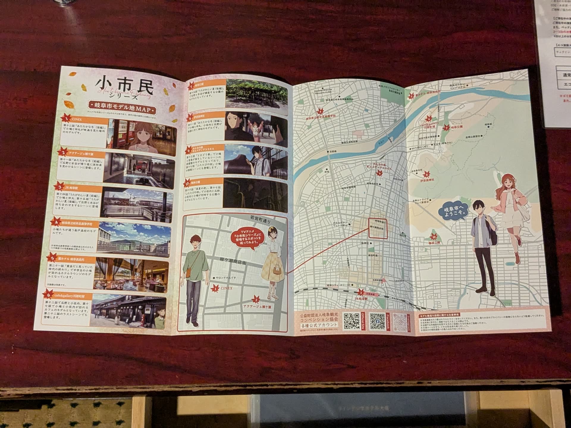 我印出的那一大疊截圖其實都有按照順序排好,在大垣當然是先去新大橋、大垣公園,再去美登鯉橋。其實我原本還有點想借飯店的腳踏車去北邊的 TomTom(將也家原型),或是西邊的青柳橋(開頭時將也小時候玩耍的地方),不過在岐阜待得太久又有下雨而且我也有點累,於是只好作罷。