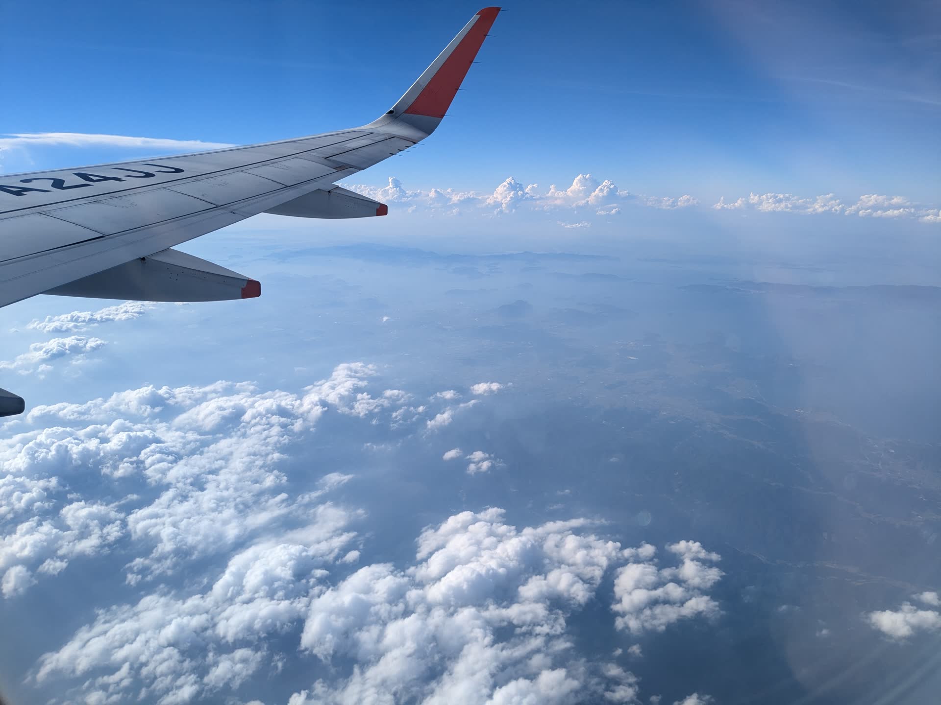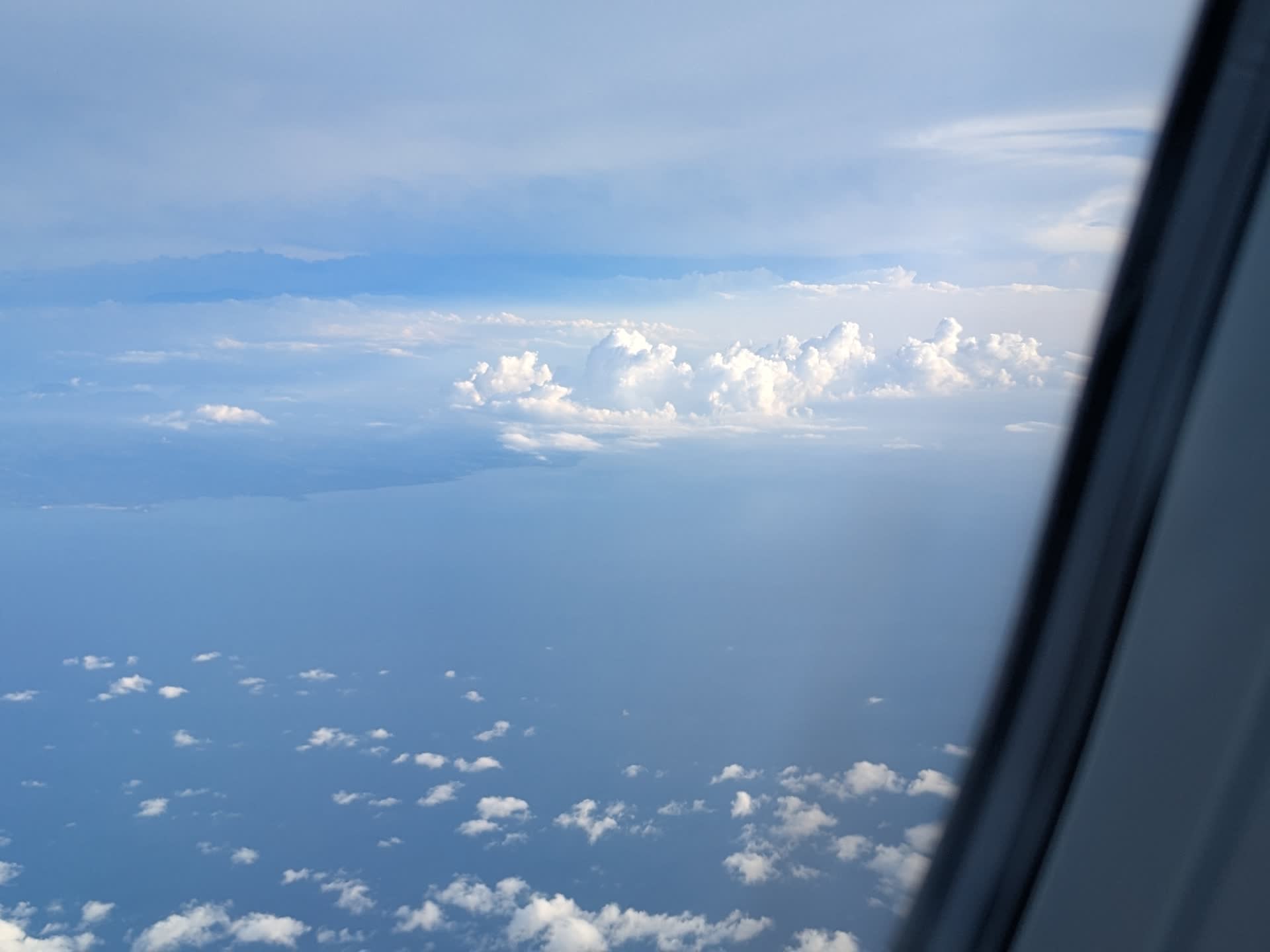 總共盤旋了三圈,其實盤旋的時候還滿不錯的,因為太陽剛好沒有很高,把低空的雲在海面上照出影子,海水也有許多漂亮的波紋。剛好我坐右邊,順時針盤旋時總是能拍到大海(左側翹高高的根本看不到什麼),而且盯著窗外的機翼會感到彷彿在盤旋的不是飛機而是整個地球,是一種非常神奇的感覺,感覺這20分鐘還算值得。