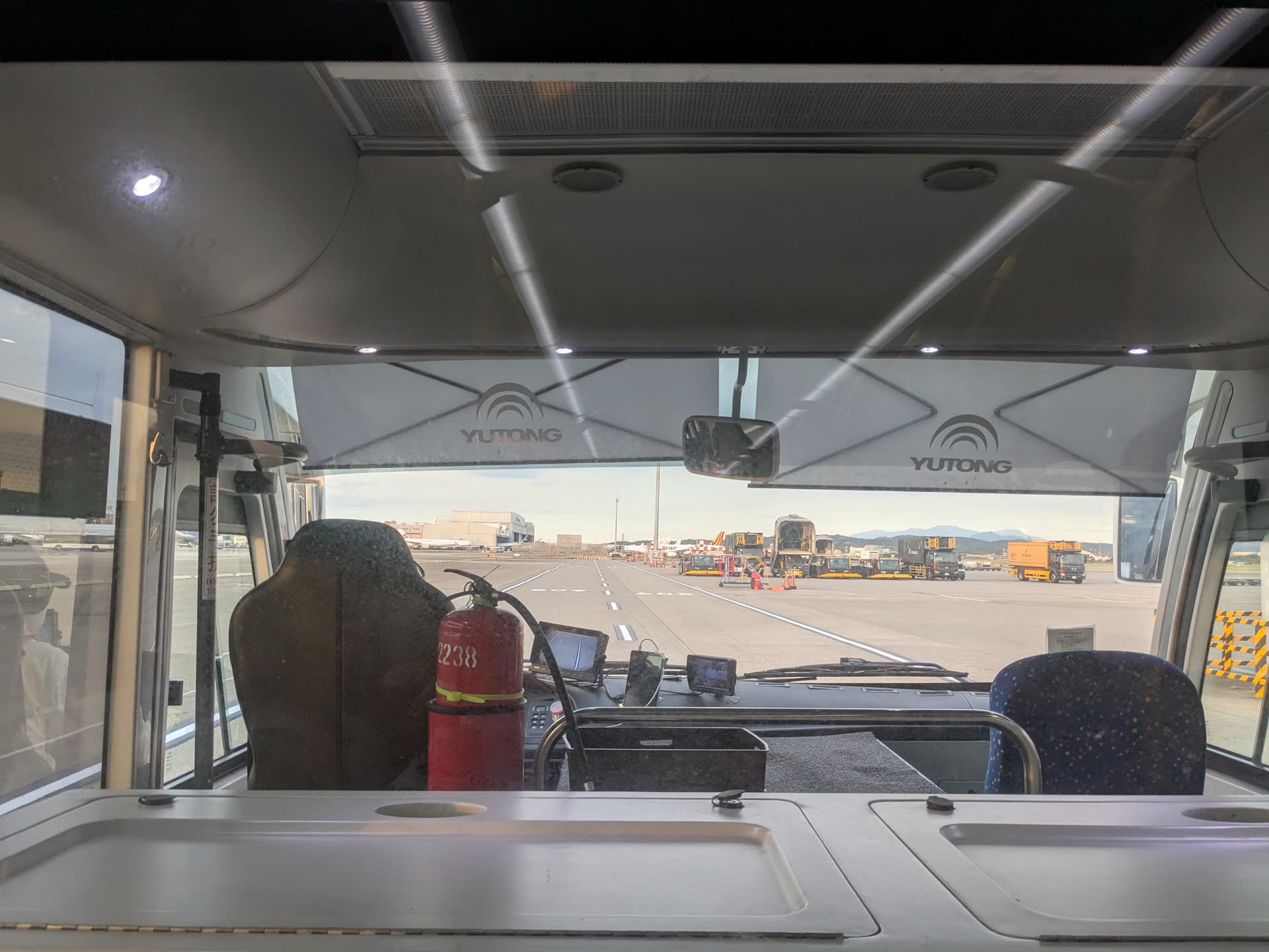 幸好我沒有登機箱,走樓梯非常輕鬆寫意。接駁車應該比正常公車大一點,但還是得要好幾輛才能接完機上的所有人。因為真的有點吵,所以我戴上降噪耳機,多少有點幫助。