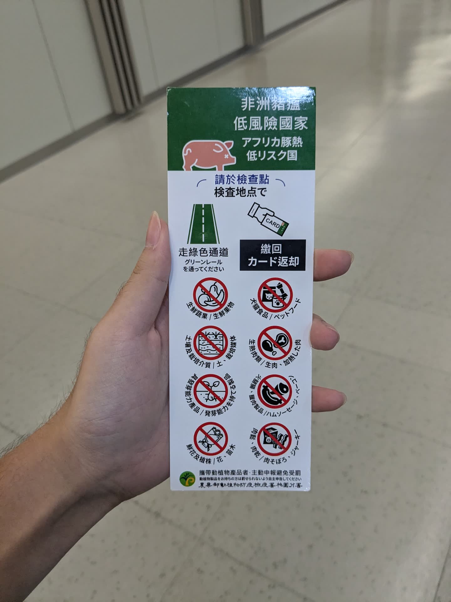 最後放一張我覺得台灣機場最莫名其妙的東西,在入境時會發一人一張確認沒有帶違禁品的小卡,在某一關繳回,感覺是在試圖喚起乘客的良心自主申報,不知道有什麼用。不過我相信海關應該是有辦法攔住帶怪東西回國的人吧,大概啦。