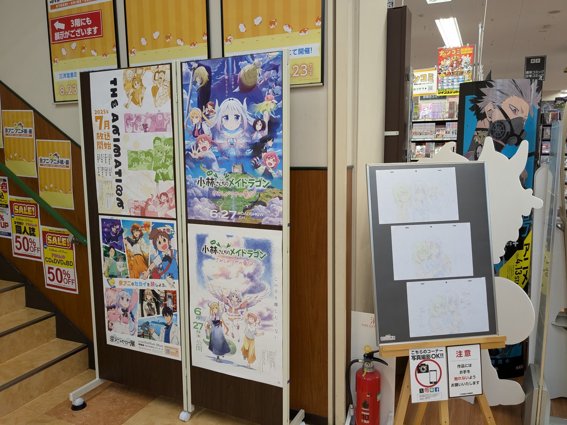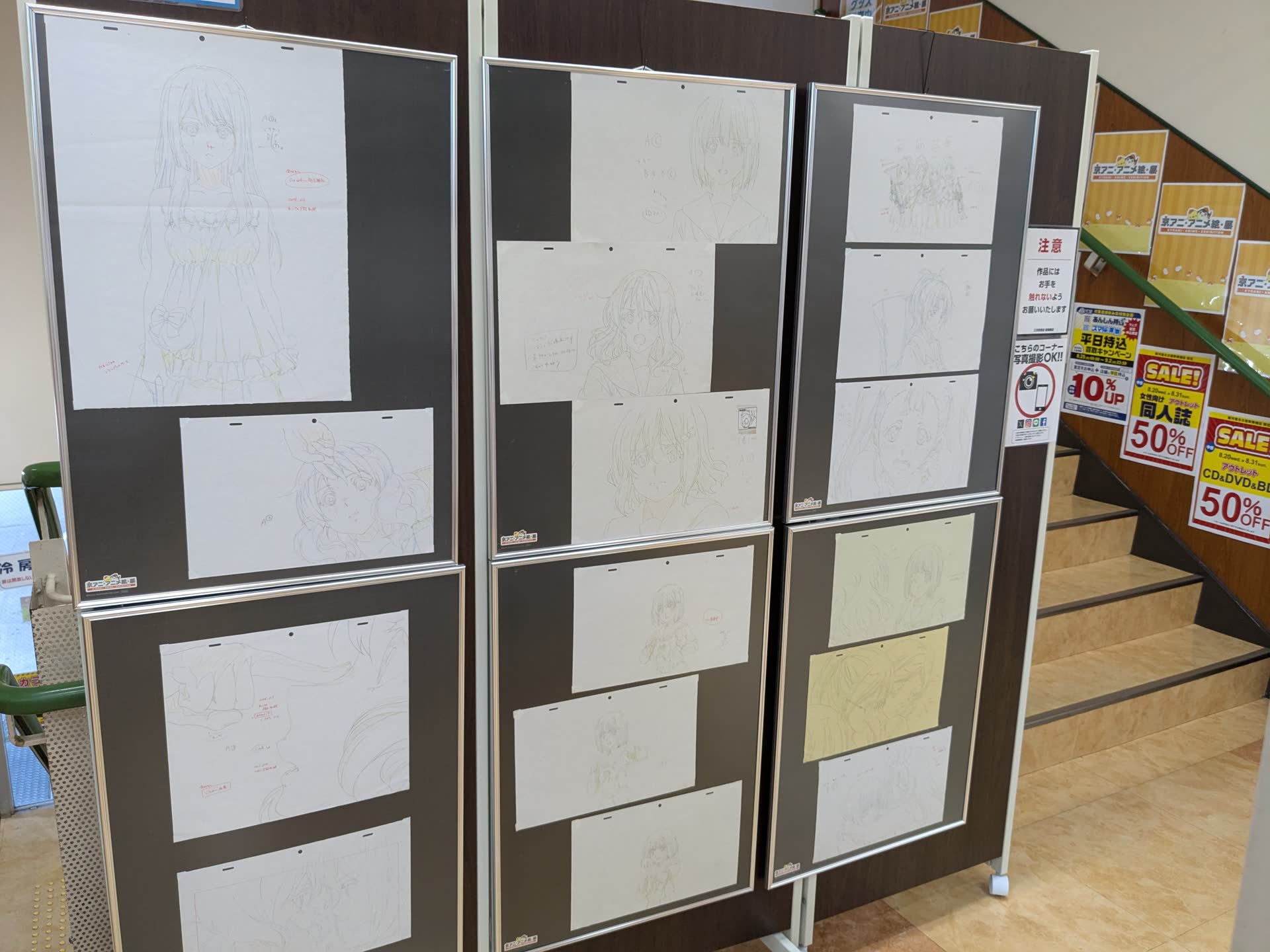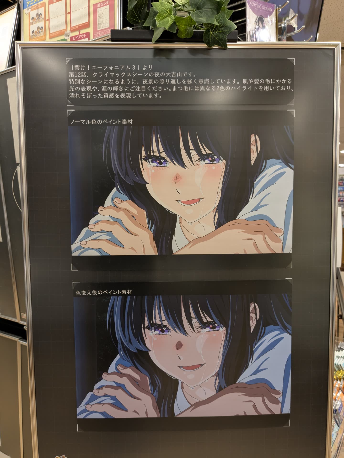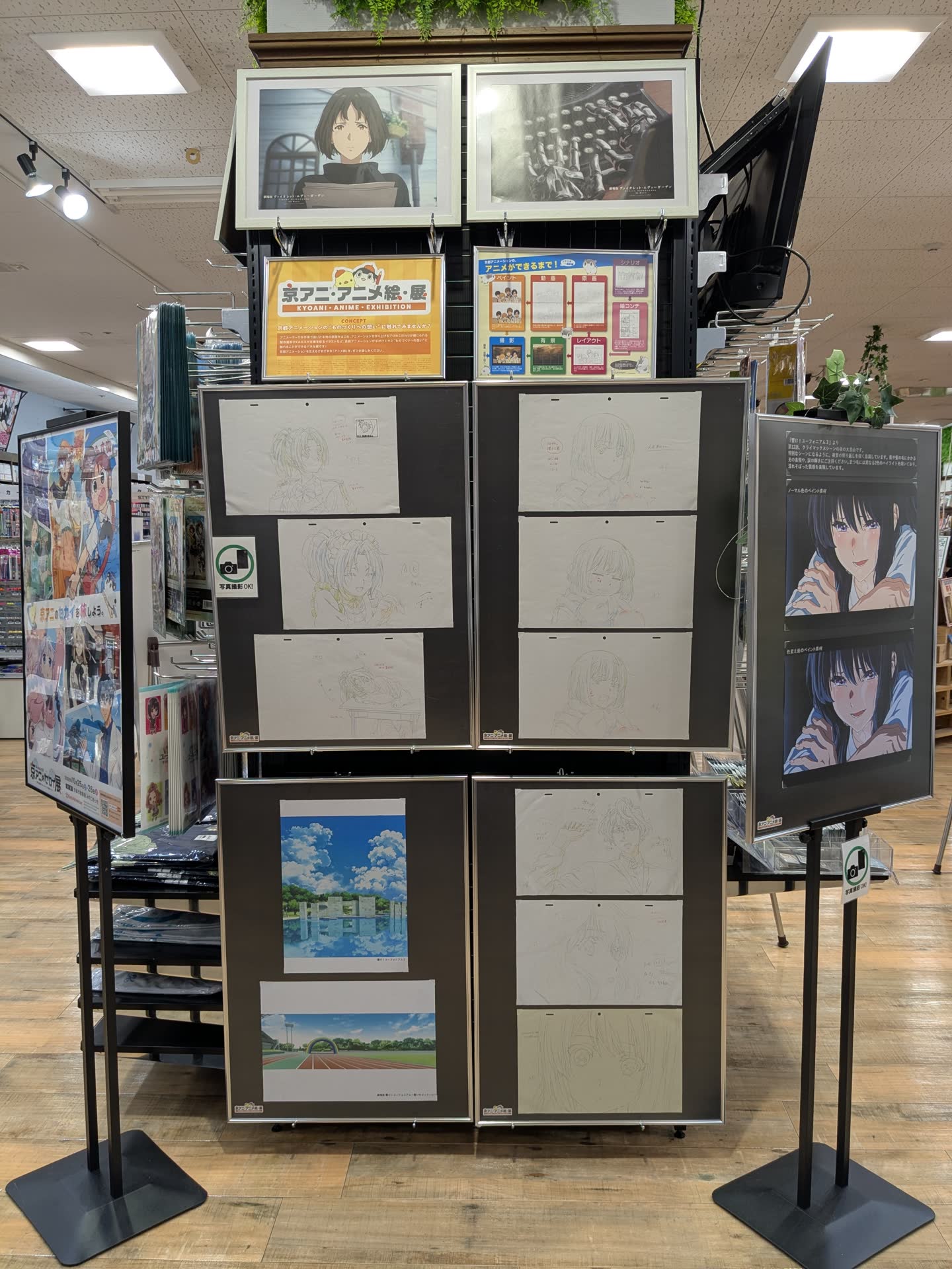 會來三洋堂書店當然是因為京阿尼的原畫展,查過二三樓都有在展示,並且二樓有京アニショップ!お取扱い店舗。進去才發現是在原畫都是放在賣場的入口,總共有6+1與8面的板子,每一面貼了二到三張原畫或是攝影效果的展示。