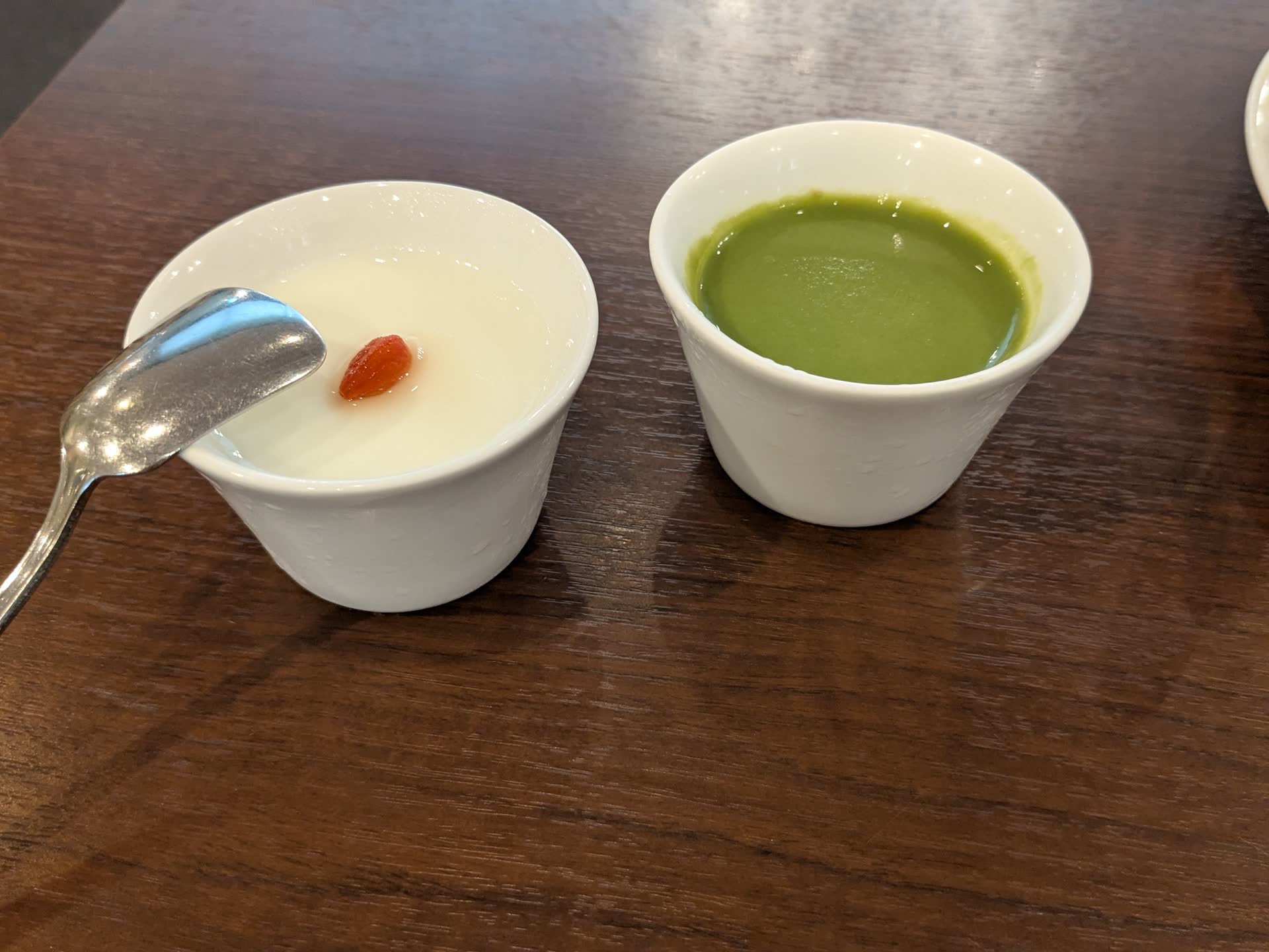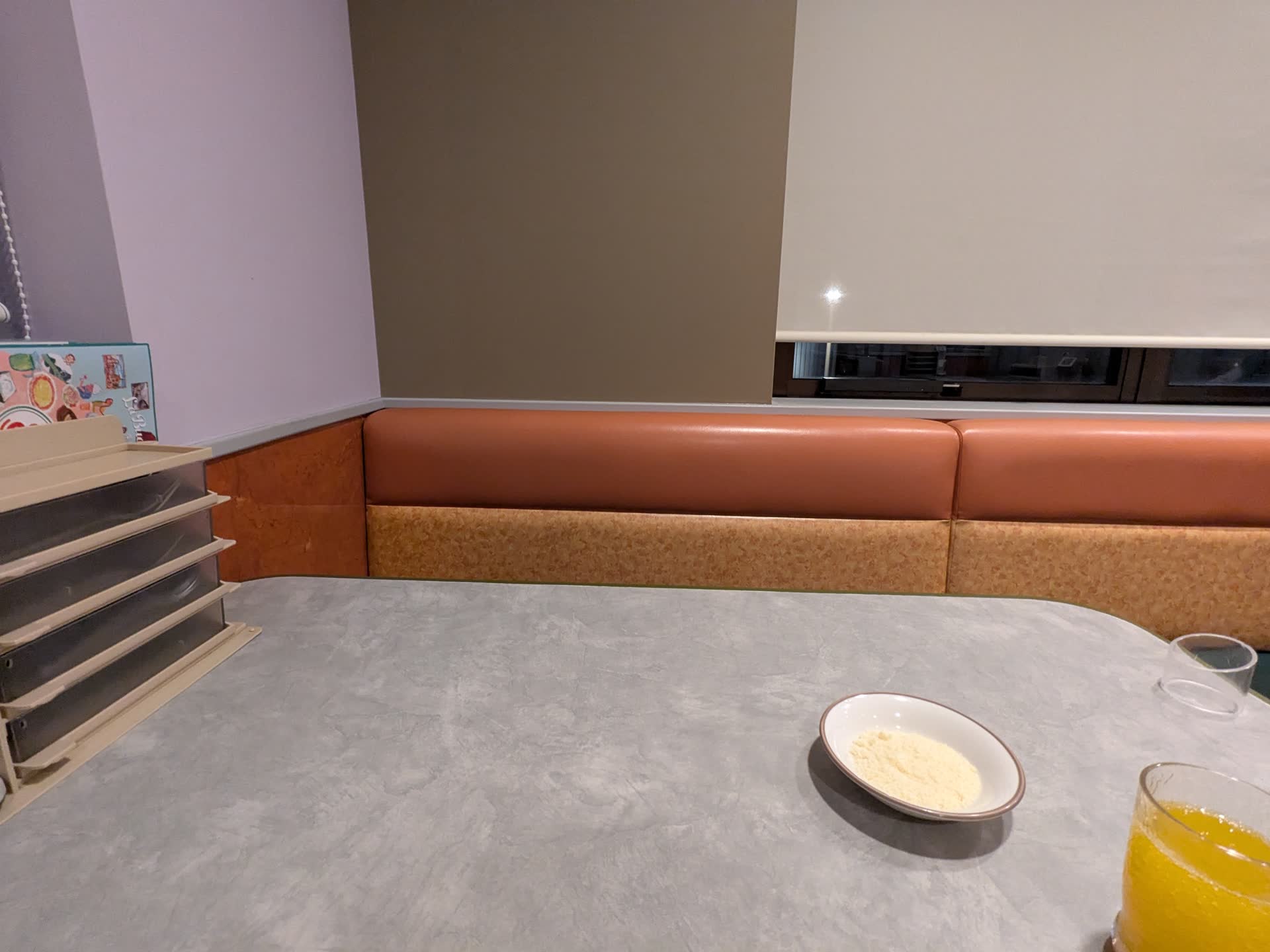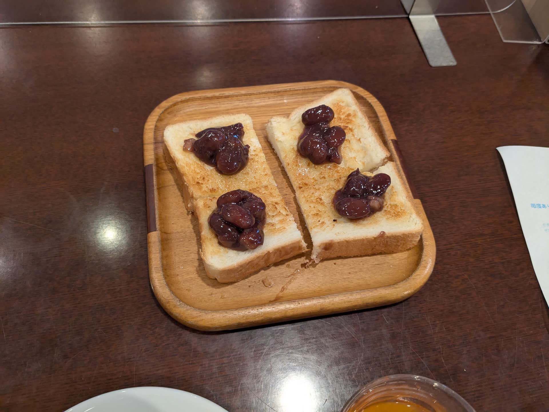 紅茶先端了上來,桌上旁邊有白色、黃色的方糖可以加,突然感覺有點高級感,好像沒那麼盤。畢竟台灣早餐店都是用立頓之類的茶包泡的,口感很澀又加一堆糖,這邊的感覺好喝許多,有香氣又不怎麼苦澀,我只加了兩顆糖。另外還有附贈一杯綜合蔬果汁,與波蜜的一樣是橘色,不過有更多纖維,且有一種特殊味道,現在(8/31)有點忘了。バター&金時あん吐司的紅豆很甜,有大有小,吃起來還不錯。但我還是覺得這餐沒有很對得起它的價格,也許是因為我沒有續紅茶,應該是可以續加的。