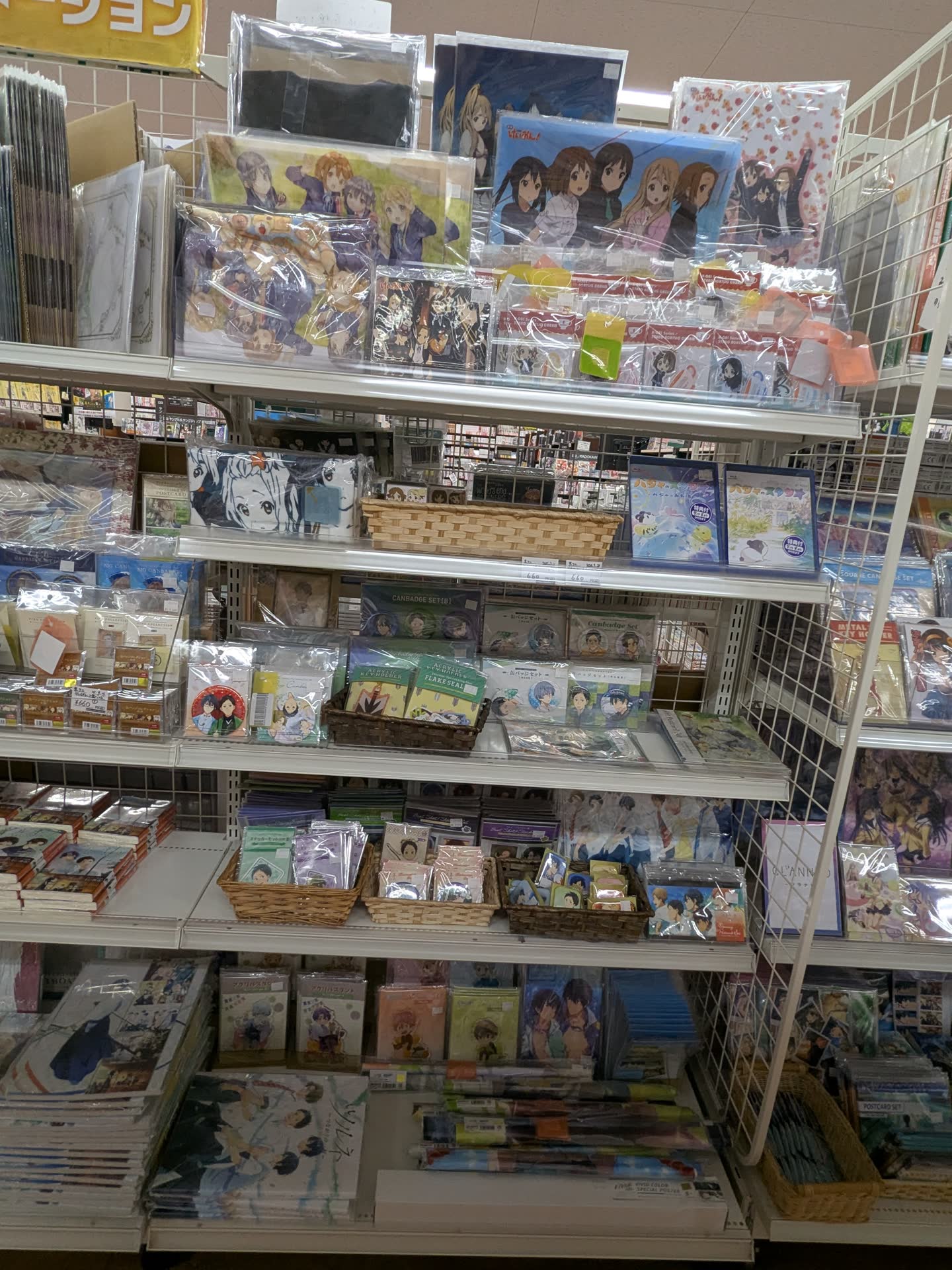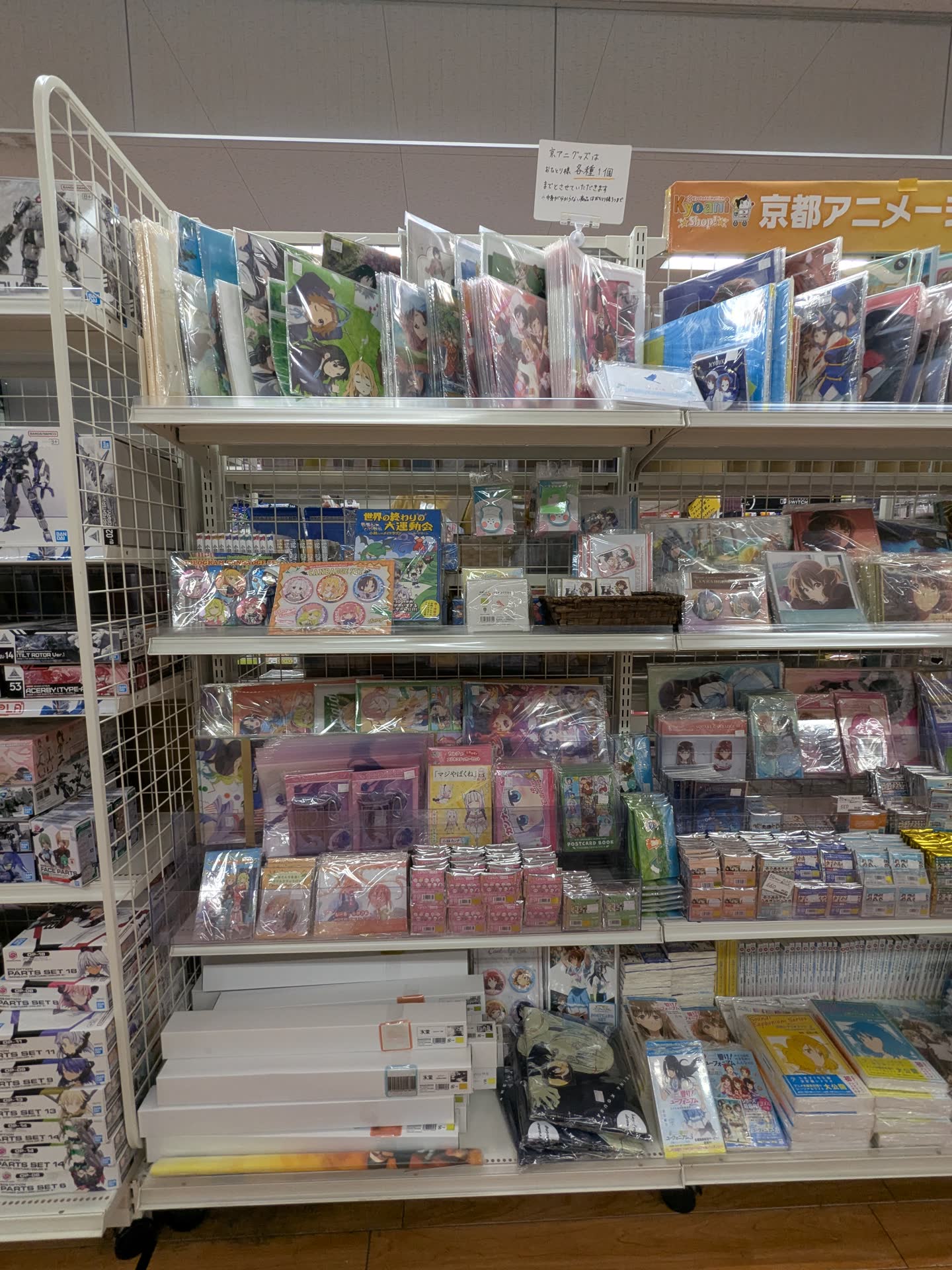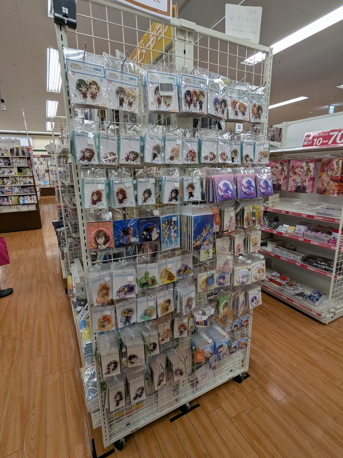 京阿尼商品的架子是整整一個貨架正反面2+4共六個區塊都是,加上側面掛了很多壓克力牌、胸章,規模非常龐大而且商品放得非常密集,商品應該是比宇治的平和書店還要多種類。我其實一直有打算買 3,300 元的京吹御朱印帳,如果在去京都前找到我就可以拿來用了,不過很可惜在這裡與京都的 JEUGIA 都沒找到。