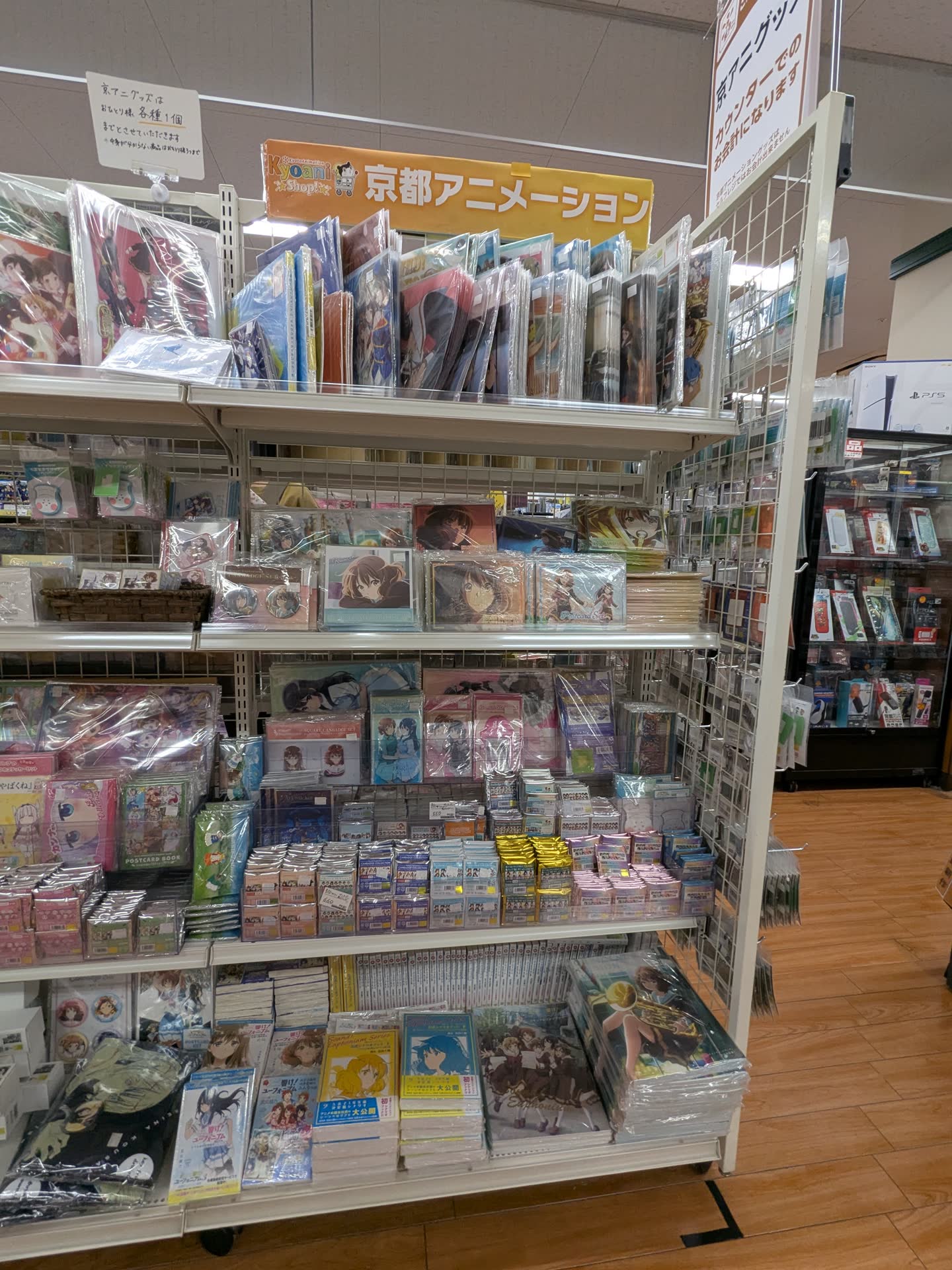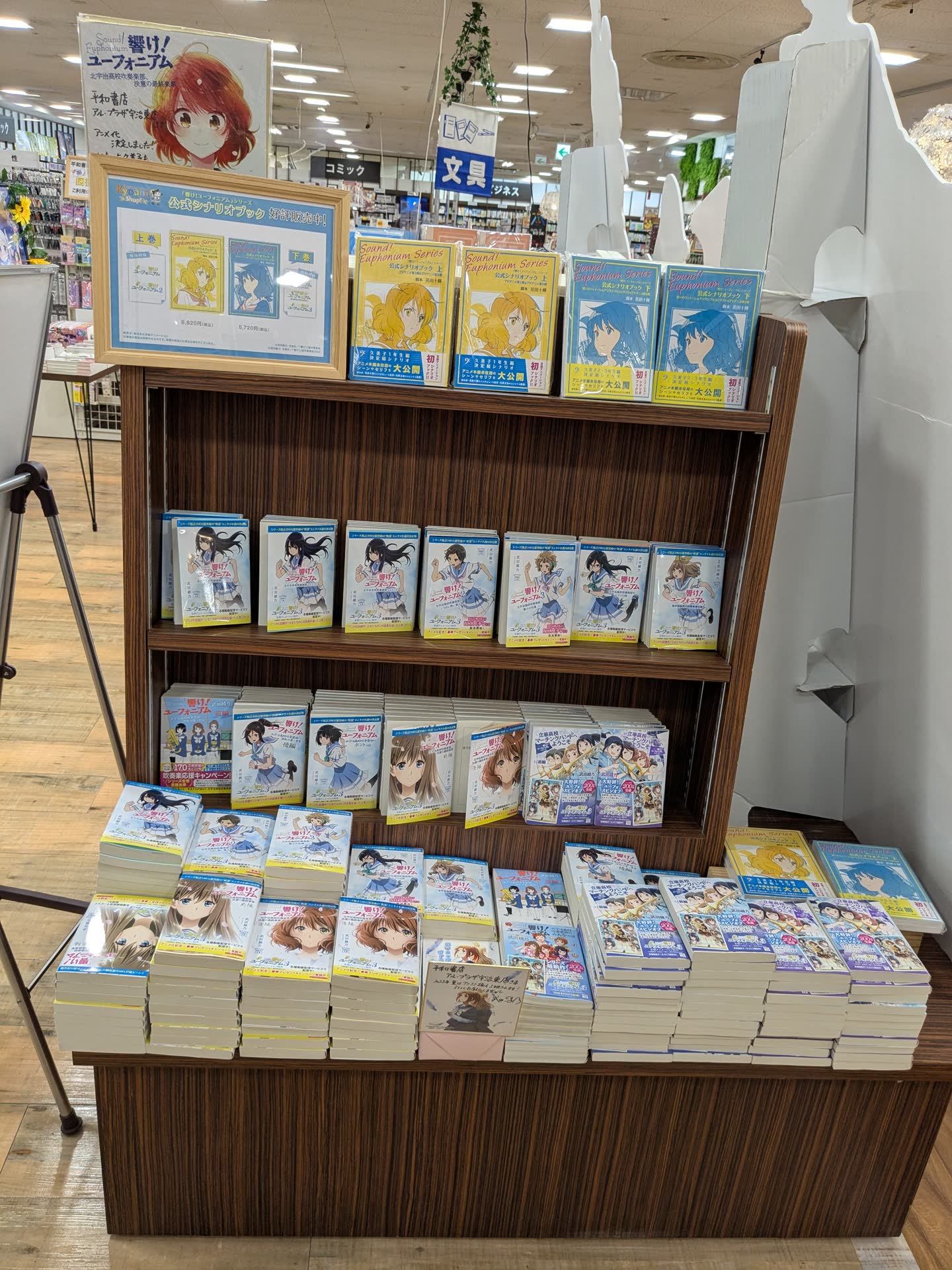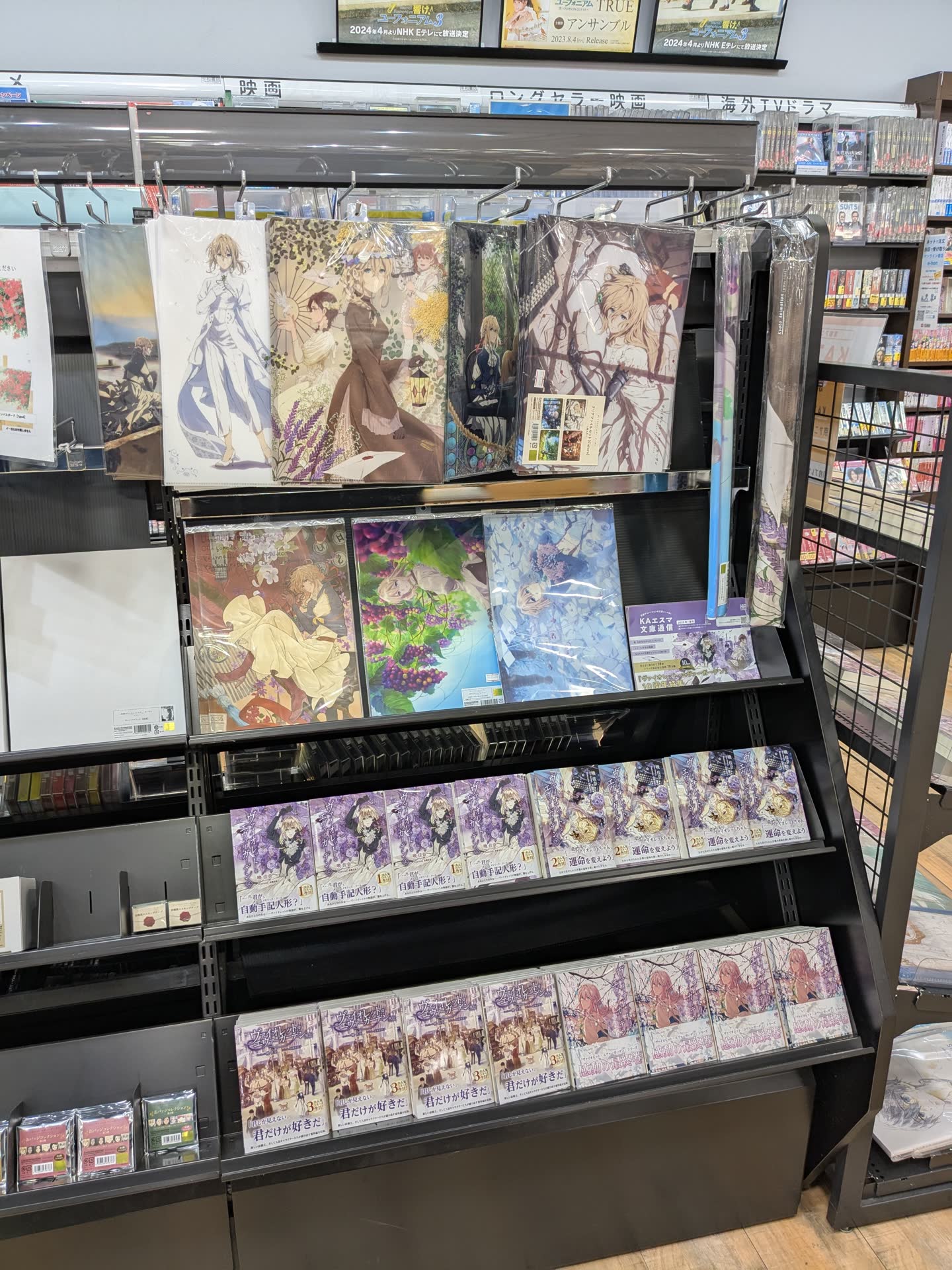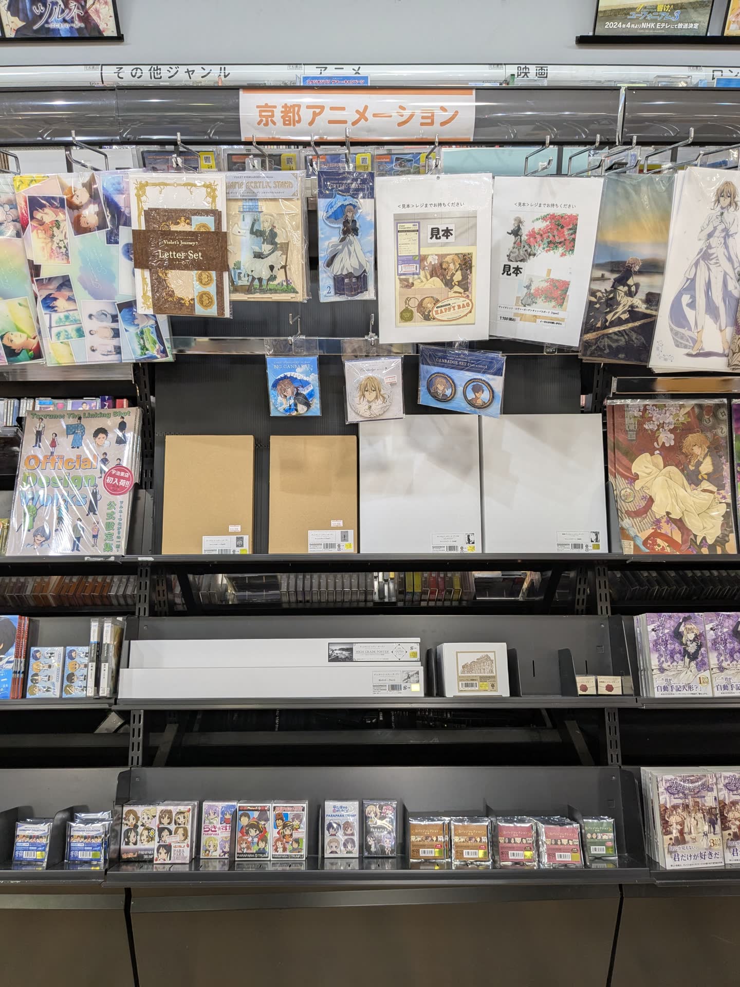 京阿尼商品的架子是整整一個貨架正反面2+4共六個區塊都是,加上側面掛了很多壓克力牌、胸章,規模非常龐大而且商品放得非常密集,商品應該是比宇治的平和書店還要多種類。我其實一直有打算買 3,300 元的京吹御朱印帳,如果在去京都前找到我就可以拿來用了,不過很可惜在這裡與京都的 JEUGIA 都沒找到。