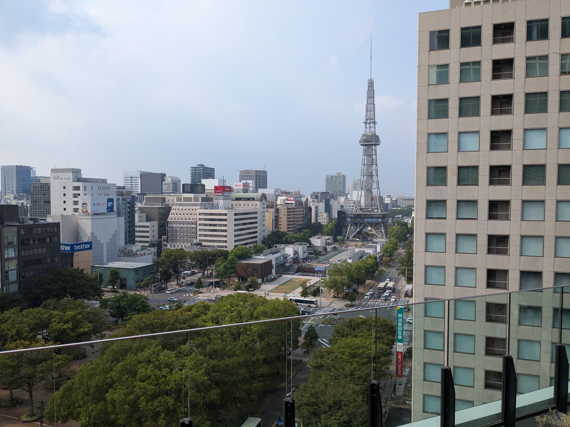 觀景台是一個平台,有圓形的草坪,邊緣往下的階梯後最外面有玻璃牆,這樣的設計實在很厲害,在沒看到階梯時會感覺彷彿走到平台邊就會掉下去一樣,有無邊際的感覺。可以看到中部電力 Mirai Tower與街景。