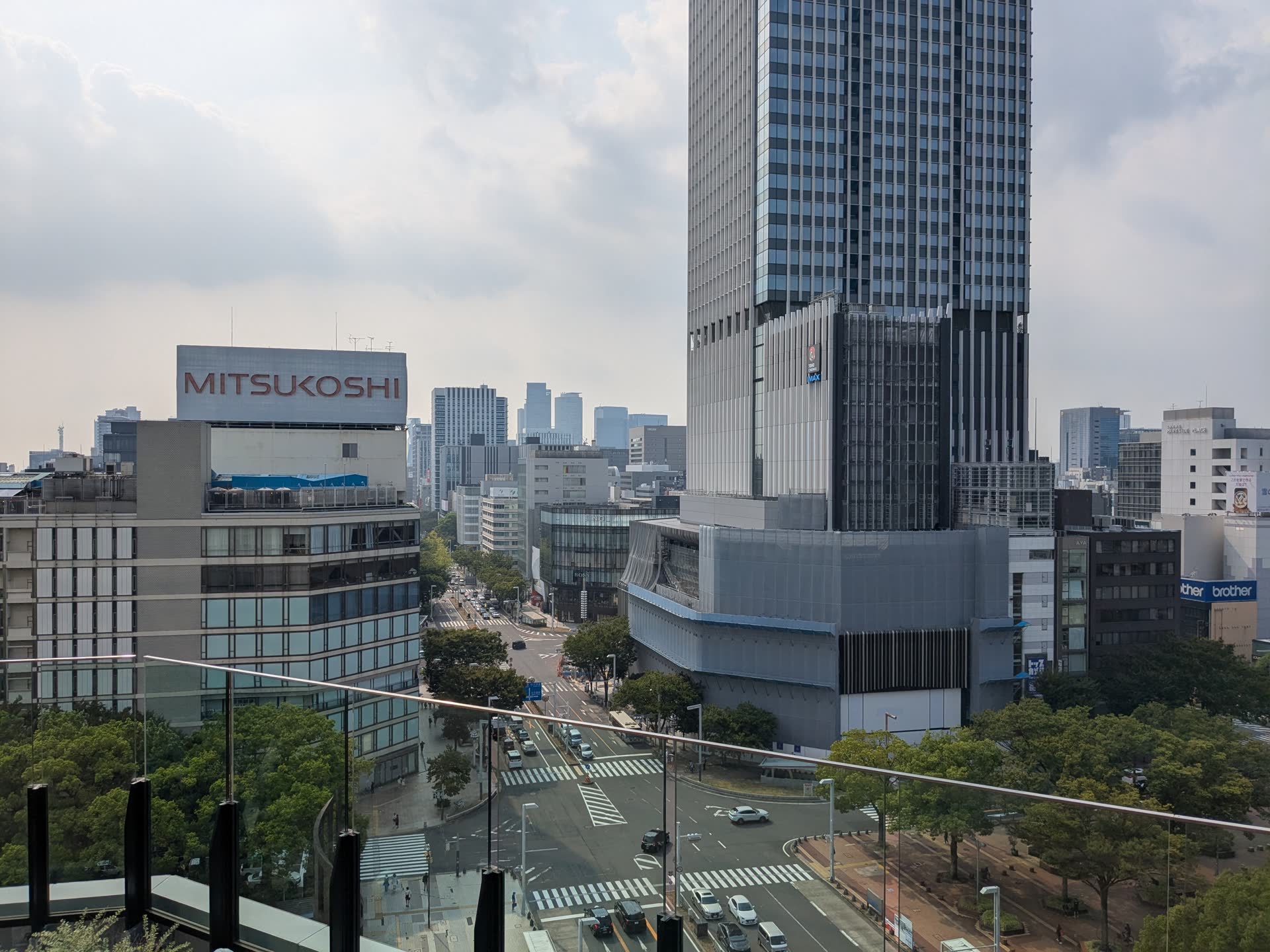 走了一陣子後我們搭地鐵到榮。我想看的是中日ビル七樓的免費觀景台,榮的車站就有直接連接到中日ビル地下一樓的路,非常貼心。我們搭手扶梯上去時看到一層樓是賣各地的土產,感覺還滿不錯的。我有點疑惑為何地下一路搭上去得要在一樓走一段路才會找到往上的手扶梯,謝一點醒我說一樓比較重要所以會有往上往下的在一起,感覺很合理。