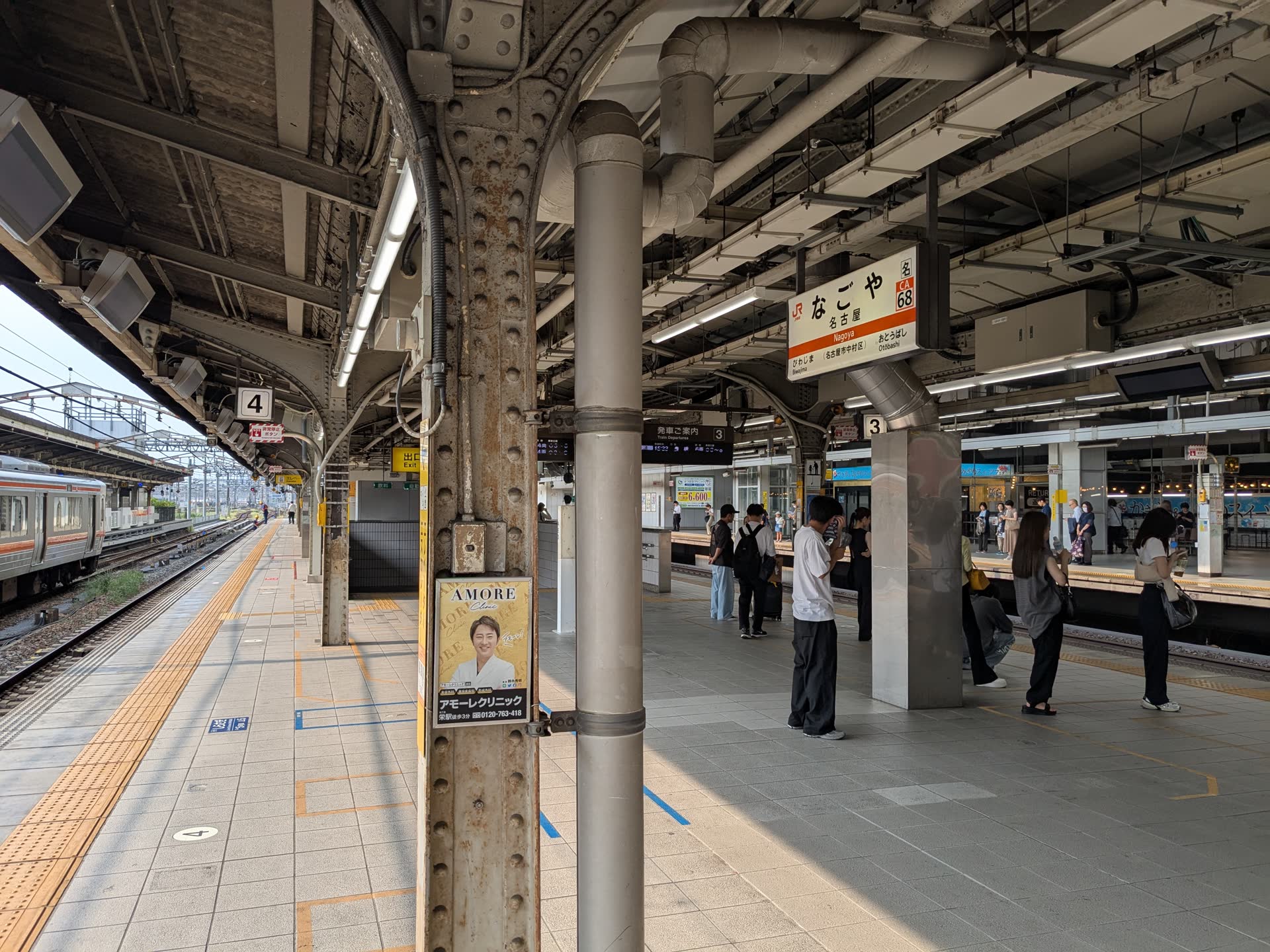 在月台等車時我買了一罐 C.C Lemon,然後還從五六月台下樓上樓去三四月台拍照再跑回去,很難想像這是搭完紅眼班機沒睡好還在名古屋大太陽下走了好久的人幹得出來的事。可惜月台數字沒看仔細,只有對到差不多的角度而已。