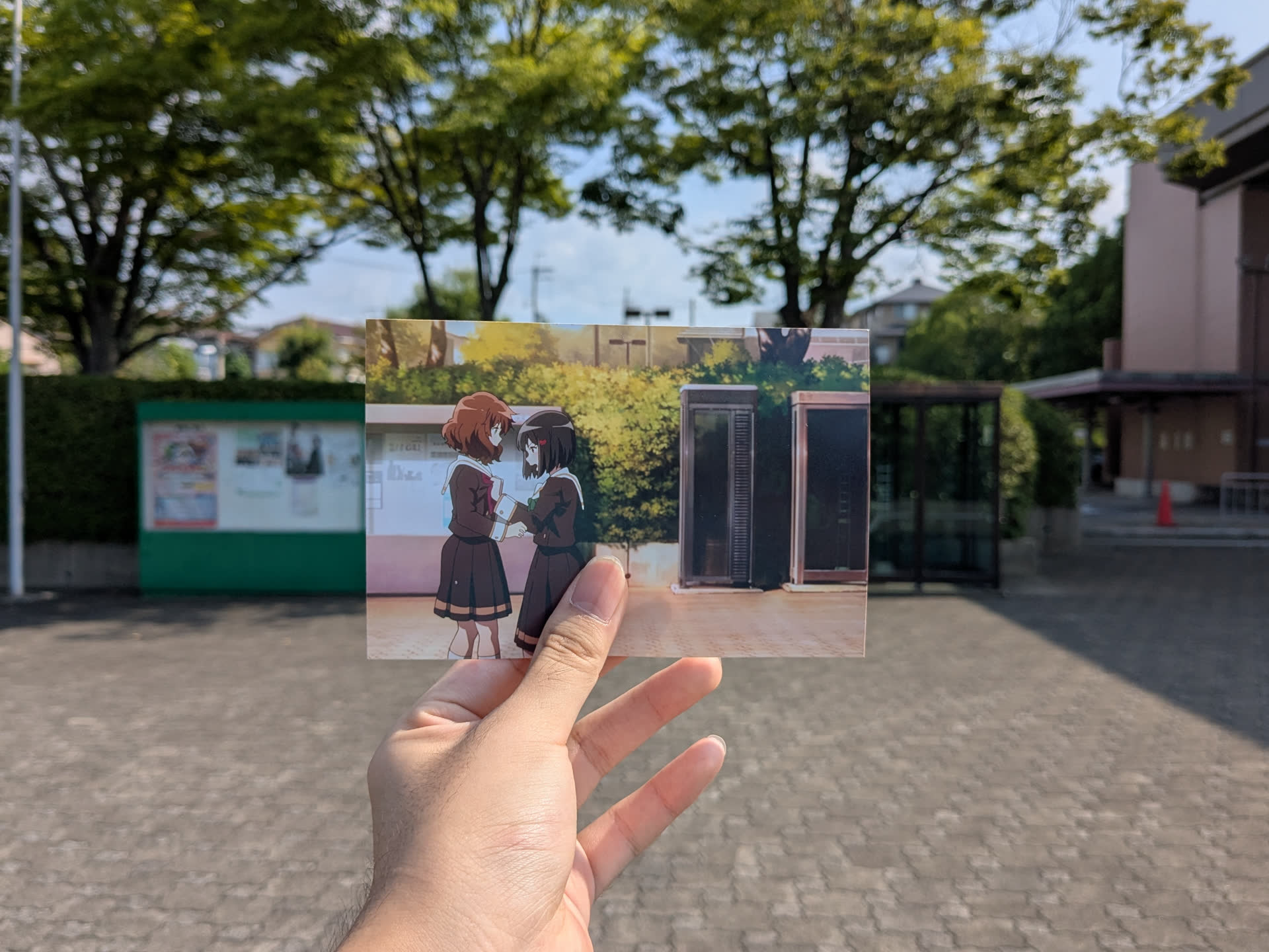 從日比野站與西高藏站下車走過去都差不多遠,我想既然京吹中的斎藤葵就是走這邊的 1 號出口,就搭到日比野站了。出了出口努力找到與截圖一模一樣的角度後,發現真的與動畫一模一樣,唯一差別大概只有樹吧。這是我這次日本行拍的第一張聖地巡禮照片,值得紀念。