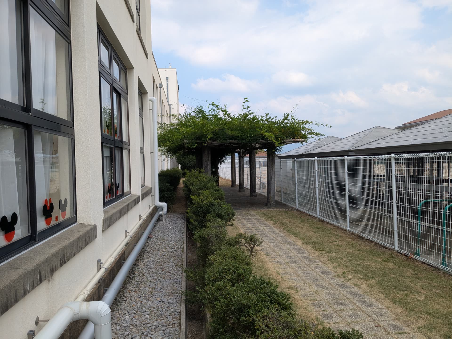 平等院南側,這邊也有個出入口,樹修剪得很高,不然大家在外面就把平等院看完了還怎麼賣票(這邊其實看不到,但久美子ベンチ那邊確實灌木滿高的)。