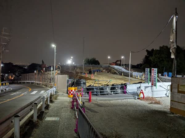 但左邊看起來完全就是工地,我很疑惑的還是走在車道上,但有靠右邊面對來車。因為右側有些住家空間還不算小,下山時的右側就直接是工地圍籬了。不過也沒關係,因為回程俯瞰時就能看到是有用鐵架與布圍了一條路直接穿越工地正中間。後來才知道左邊確實就是工地專門為行人、腳踏車開闢的臨時通道,這方面日本人真的很用心,不知道是否是法律規定的,工地把人行道封起來的話就開闢了替代道路。因此當然其實上去時也該走左邊。