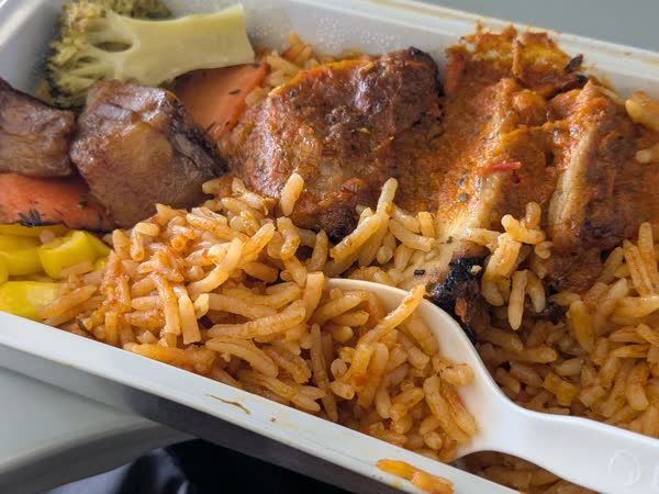 這次飛機餐我是點「Grilled Peri Chicken with Jollof Rice」,上次吃過椰漿飯這次換個口味。米是西非的米,很長,滿特別的,味道就是一樣辣辣香香的,稍微有一些肉、馬鈴薯、玉米等,不過紅蘿蔔有點燒焦。感覺亞航的飛機餐真的滿划算的,這樣才 126 台幣,主要是省下在日本又要吃飯的時間和錢,晚上到住宿處可以直接休息,或是像這次是行李放車站直接衝去看夜景,也很不錯。份量當然是很少,塞牙縫而已,不過還算能充飢,以在家吃完午餐搭配這頓來說晚上應該是都還好。