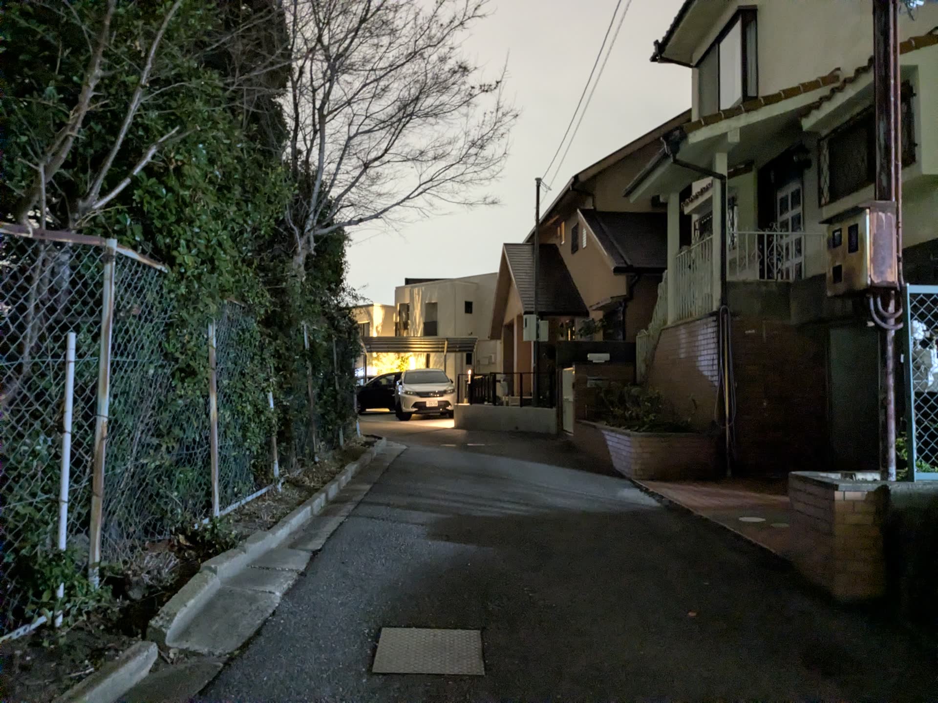 從小路出來右轉的坡道小沢西宮線風景也有些變化,電影中的全家理論上是在西南側接近最高點,那邊有棟很像的建築,但現在已經拆除。另外東北側很高的牆也是已改建。其他很多截圖線索都很少,不然就是還原度不高,所以我就只拍了以下這兩張。